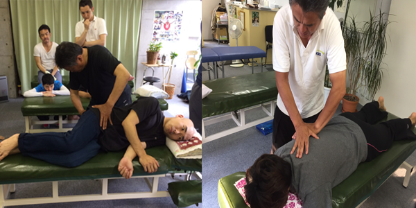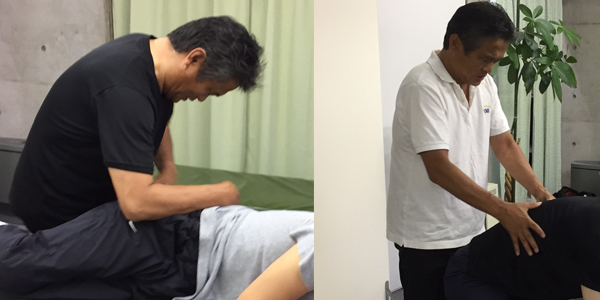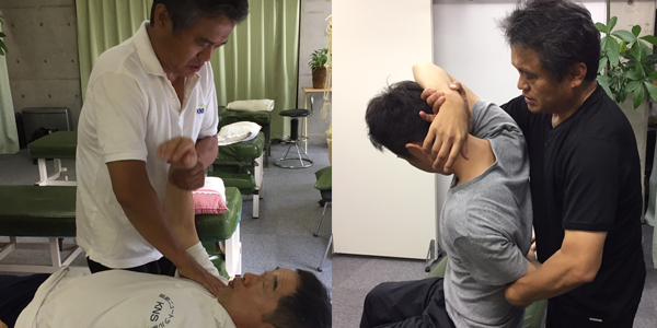 まず他動運動で関節を被う膜を整えて(柔軟性を回復させます)から自動運動 (PNFを応用発展させたPNF整体を用います)によって支持性を回復させます。